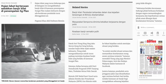 Bernama (2025) Hujan Lebat Berterusan Sebabkan Banjir Kilat Di Penempatan Sg Plan. Utusan Borneo (Sarawak). |