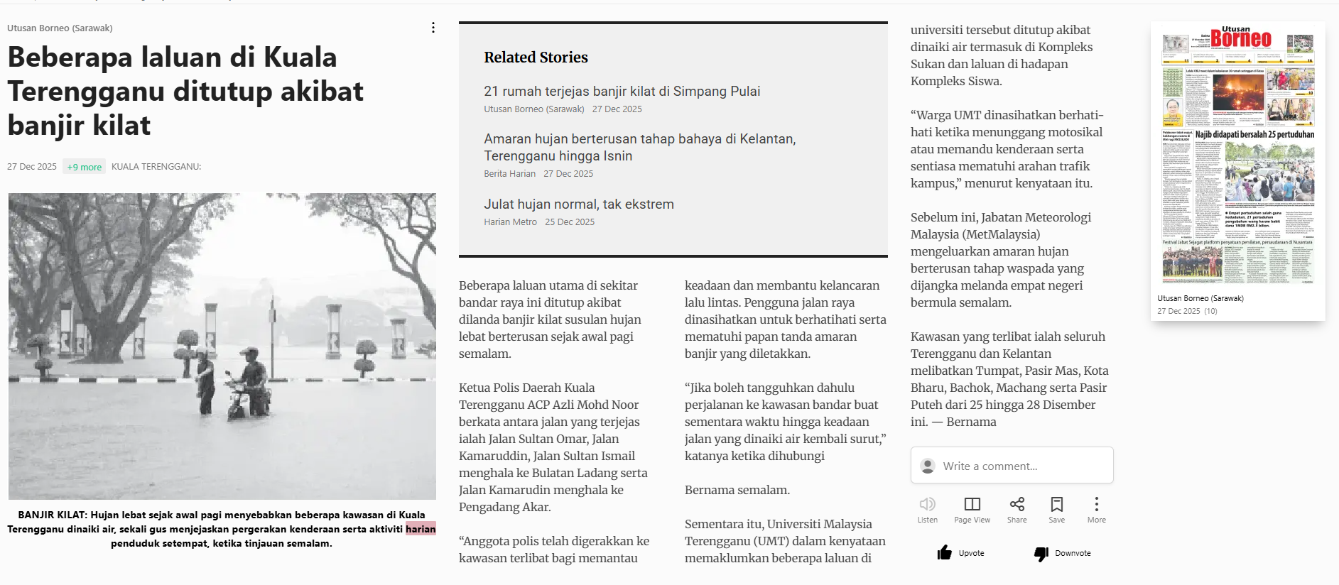 Bernama (2025) Beberapa Laluan Di Kuala Terengganu Ditutup Akibat Banjir Kilat. Utusan Borneo (Sarawak). |