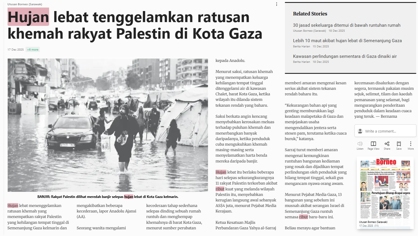 Bernama (2025) Hujan Lebat Tenggelamkan Ratusan Khemah Rakyat Palestin Di Kota Gaza. Utusan Borneo (Sarawak). |