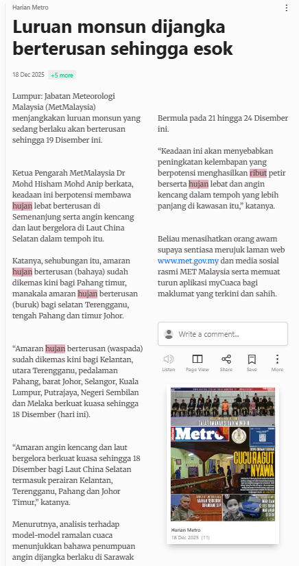 Bernama (2025) Luruan Monsun Dijangka Berterusan Sehingga Esok. Berita Harian. |