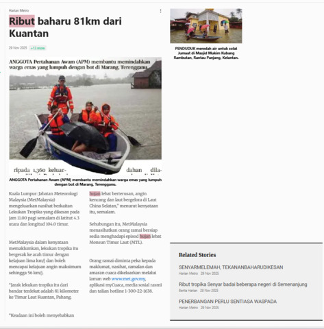 Bernama (2025) Ribut Baharu 81km Dari Kuantan. Harian Metro. |