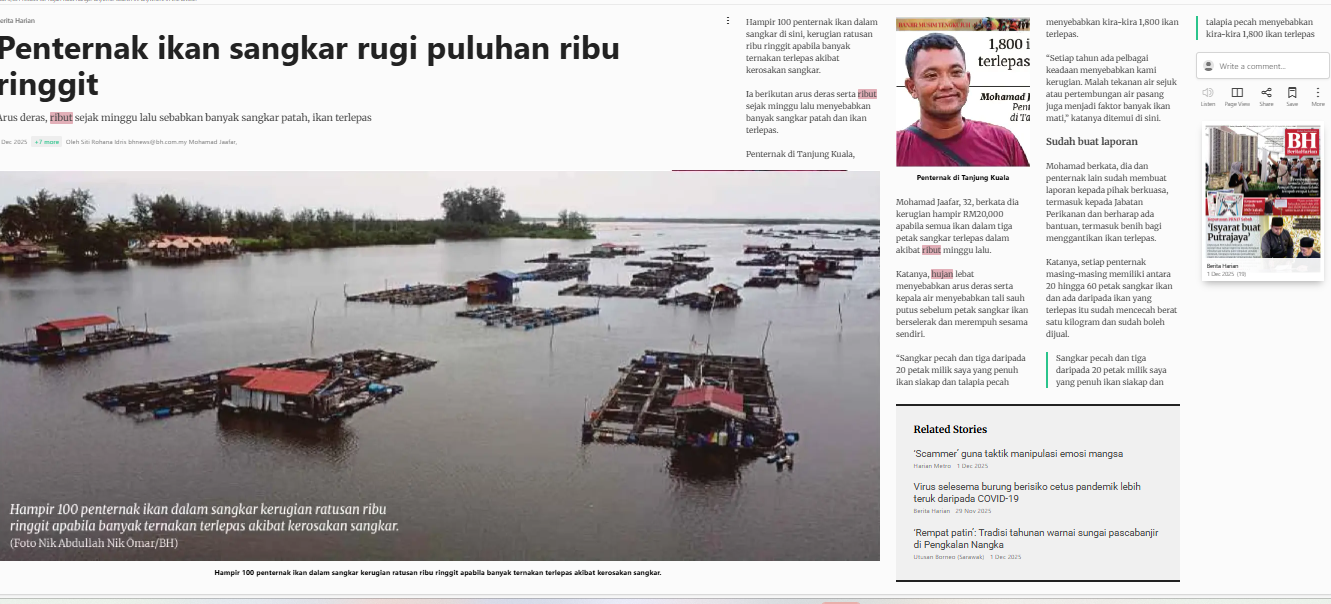 Siti Rohana Idris (2025) Penternak Ikan Sangkar Rugi Puluhan Ribu Ringgit. Berita Harian. |