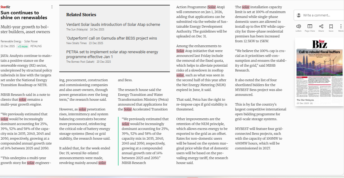 Bernama (2025) Sun Continues To Shine On Renewables. The star Malaysia. |