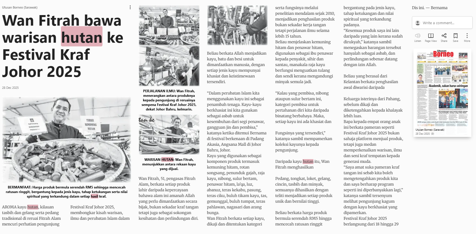 Bernama (2025) Wan Fitrah bawa warisan hutan ke Festival Kraf Johor 2025. Utusan Borneo (Sarawak). |