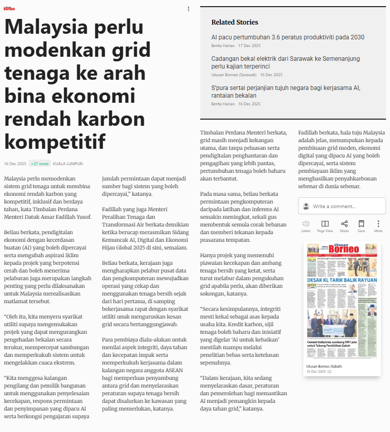 Bernama (2025) Malaysia perlu modenkan grid tenaga ke arah bina ekonomi rendah karbon kompetitif. Utusan Borneo (Sabah). |