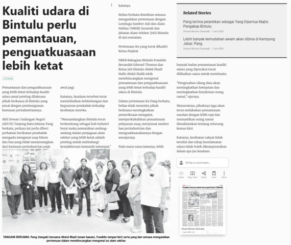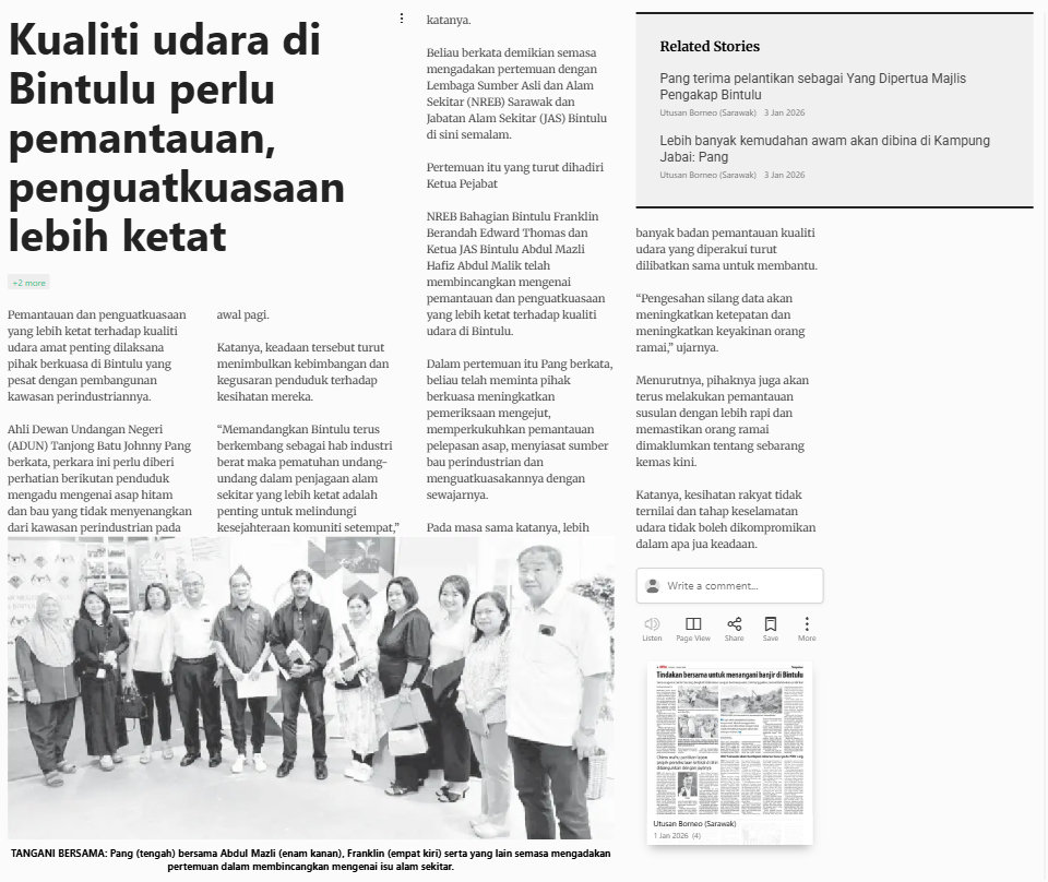 Bernama (2026) Kualiti udara di Bintulu perlu pemantauan, penguatkuasaan lebih ketat. Utusan Borneo (Sarawak). |