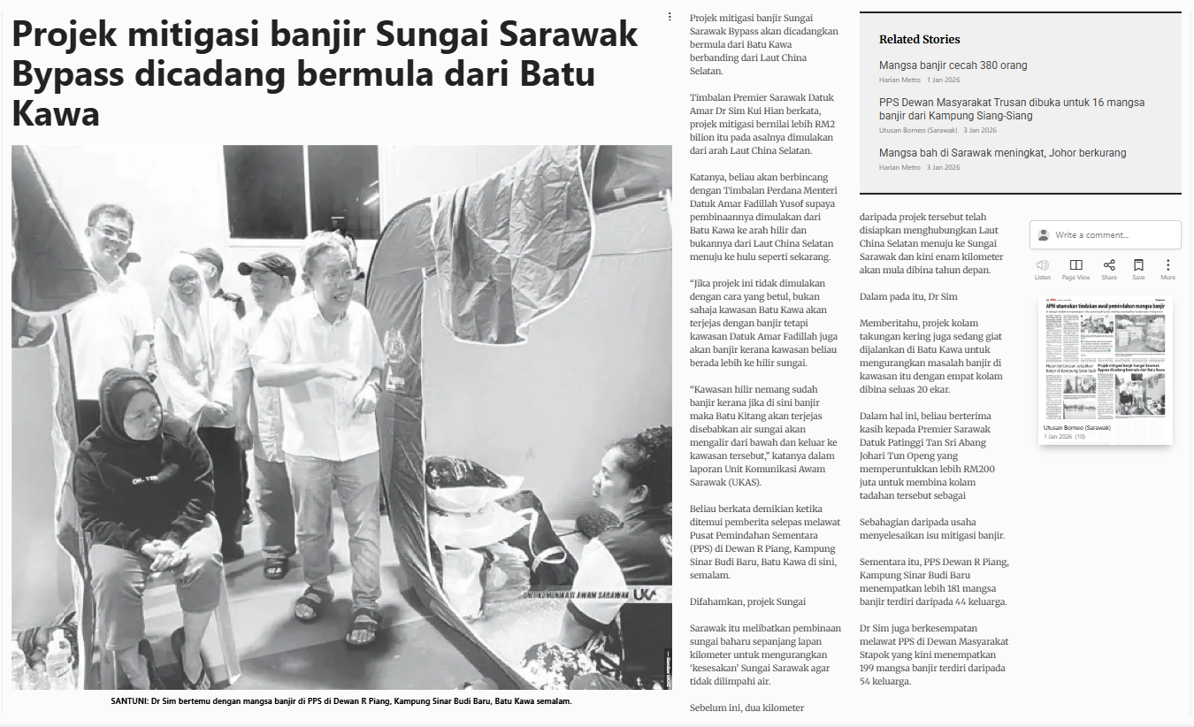 Bernama (2026) Projek mitigasi banjir Sungai Sarawak Bypass dicadang bermula dari Batu Kawa. Utusan Borneo (Sarawak). |