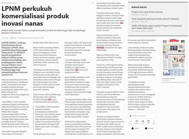 Linda Buang (2025) LPNM perkukuh komersialisasi produk inovasi nanas. Utusan Borneo (Sarawak). |