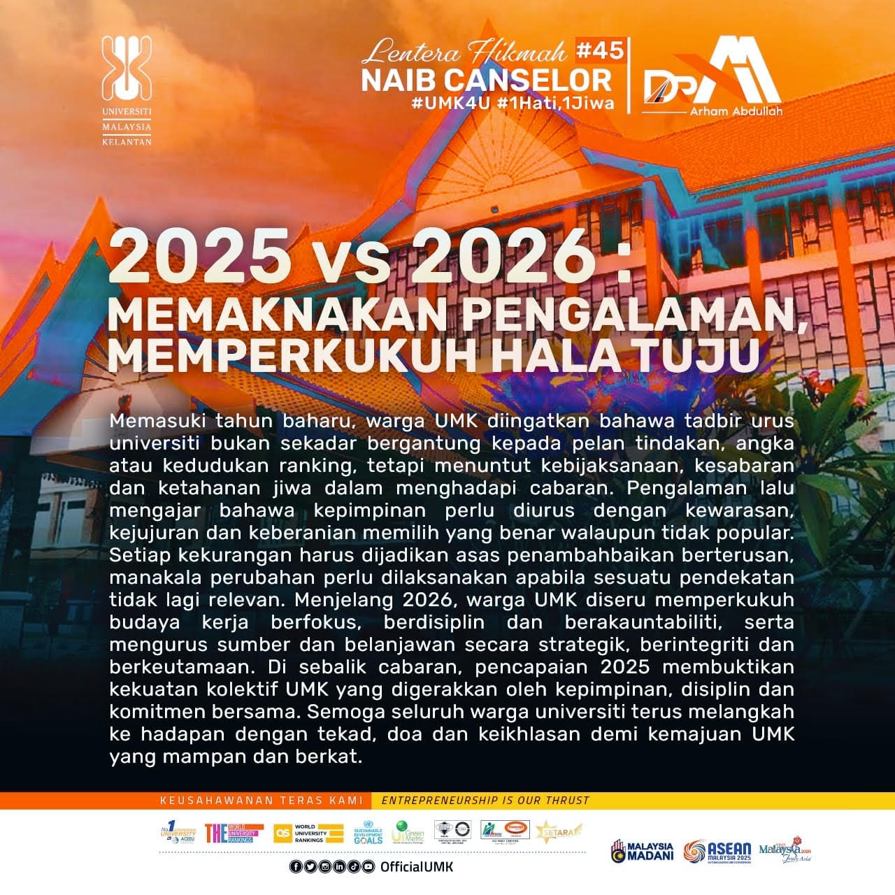 “2025 vs 2026 : MEMAKNAKAN PENGALAMAN, MEMPERKUKUH HALA TUJU” Assalamualaikum Warahmatullahi Wabarakatuh. Salam UMK4U 1 Hati 1 Jiwa. Warga UMK yang saya hormati, Dengan lafaz yang mulia Bismillahirrahmanirrahim, kita melangkah ke tahun baharu dengan kematangan yang terbina hasil daripada pelbagai pengalaman, peringatan dan pencapaian yang telah dilalui sebelum ini. Sepanjang perjalanan yang lalu, kita disedarkan bahawa tadbir urus sesebuah universiti bukanlah sekadar berteraskan kepada pelan tindakan, angka mahupun kedudukan ranking semata-mata, sebaliknya ia menuntut kepada kebijaksanaan, kesabaran serta ketahanan jiwa dalam mendepani cabaran yang tidak sentiasa mudah atau selesa. Sepanjang tahun lalu, kita telah melalui pelbagai situasi yang menguji keupayaan pengurusan dan kematangan kolektif warga universiti. Terdapat perancangan yang dapat dilaksanakan dengan lancar, dan tidak kurang juga yang perlu disemak serta disusun semula. Ada keputusan yang dapat diterima dengan baik, manakala sebahagiannya mengundang persoalan dan perbincangan. Dalam kepelbagaian keadaan ini, satu pengajaran penting dapat dirumuskan iaitu amanah kepimpinan tidak boleh diurus berlandaskan emosi, persepsi semata-mata atau penilaian yang terburu-buru. Sebaliknya, ia menuntut kewarasan dalam membuat pertimbangan, kejujuran dalam melaksanakan tanggungjawab serta keberanian untuk melakukan perkara yang benar, walaupun ia tidak sentiasa popular. Daripada pengalaman inilah terbitnya kesedaran bahawa segala kekurangan yang pernah berlaku bukanlah untuk disesali, sebaliknya dijadikan asas penambahbaikan yang berterusan pada masa akan datang. Proses ini membentuk kita menjadi lebih teliti dalam membuat keputusan, lebih jujur menilai kelemahan dan lebih berani membetulkan kebiasaan yang tidak lagi sesuai, serta membudayakan amalan yang benar. Hakikatnya, perubahan jarang hadir dalam keadaan yang selesa dan sering kali mencetuskan reaksi yang pelbagai. Namun, perubahan tetap perlu dilaksanakan apabila sesuatu pendekatan tidak lagi relevan dengan keperluan semasa dan hala tuju organisasi. Memasuki tahun 2026, besar harapan saya agar seluruh warga UMK dapat memperkukuhkan azam, membulatkan tekad untuk mengamalkan budaya kerja yang lebih berfokus, berdisiplin dan berakauntabiliti di semua peringkat. Setiap keputusan dan pelaksanaan hendaklah diselaraskan dengan hala tuju strategik universiti serta dilaksanakan secara terancang dan konsisten. Penilaian terhadap setiap usaha juga wajar berasaskan impak yang boleh diukur, agar sumber yang digerakkan benar-benar memberikan pulangan strategik dan menyumbang secara signifikan kepada pencapaian universiti. Sepertimana yang telah saya maklumkan semasa pembentangan Belanjawan UMK 2026 pada 23 Disember yang lalu, bahawa pengurusan belanjawan universiti perlu difahami sebagai satu instrumen strategik dan bukannya dianggap sebagai sumber yang boleh diakses tanpa pertimbangan wajar. Setiap peruntukan hendaklah diurus secara cermat, berkeutamaan dan berintegriti, selari dengan keperluan sebenar bagi menyokong kualiti perkhidmatan serta meningkatkan impak dan daya saing universiti secara mampan. Di sebalik segala cabaran yang dihadapi, tahun 2025 tetap mencatatkan pencapaian yang signifikan hasil usaha kolektif seluruh warga UMK. Setinggi-tinggi tahniah dan terima kasih saya rakamkan kepada semua yang telah bekerja dengan penuh komitmen, konsisten dan berdisiplin. Tidak lupa kepada semua Ketua-Ketua Jabatan yang telah memainkan peranan penting dalam mengemudi setiap kejayaan ini. Kepada semua Ketua-Ketua Jabatan yang baharu dilantik, jalankan tanggungjawab dan amanah yang telah diberikan. Saya yakin bahawa kekuatan universiti ini terletak pada daya kepimpinan yang jitu, tahap disiplin kerja yang mantap, kejujuran dalam memikul amanah serta kesepaduan komitmen untuk terus melangkah ke hadapan secara lebih tersusun, jelas dan berfokus. Akhir kata, saya menyeru kepada seluruh warga UMK, sentiasalah maniskan bibir dengan menyebut "Rabbi yassir wa lā tu‘assir, Rabbi tammim bil khayr” yang bermaksud “Wahai Tuhanku, permudahkanlah dan jangan Engkau persulitkan. Wahai Tuhanku, sempurnakanlah segala urusan kami dengan kebaikan.” Sekian, terima kasih. Ikhlas daripada, |