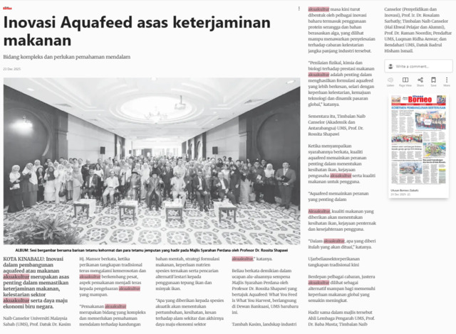 Bernama (2025) Inovasi Aquafeed asas keterjaminan makanan. Utusan Borneo (Sabah). |