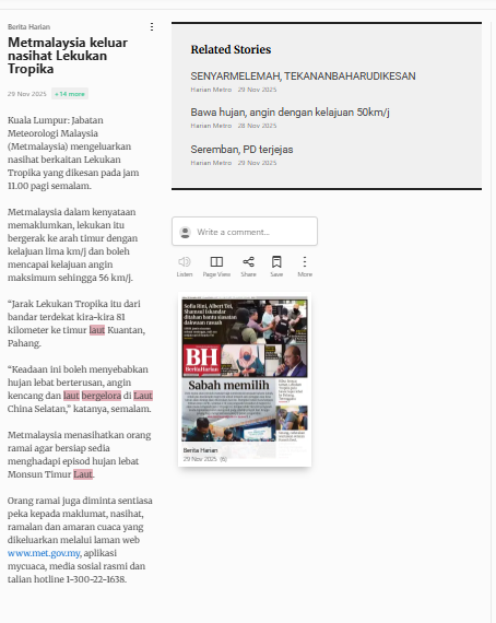 Bernama (2025) Metmalaysia Keluar Nasihat Lekukan Tropika. Berita Harian. |