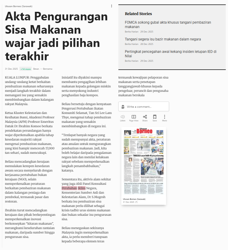 Bernama (2025) Akta Pengurangan Sisa Makanan wajar jadi pilihan terakhir. Utusan Borneo (Sarawak). |