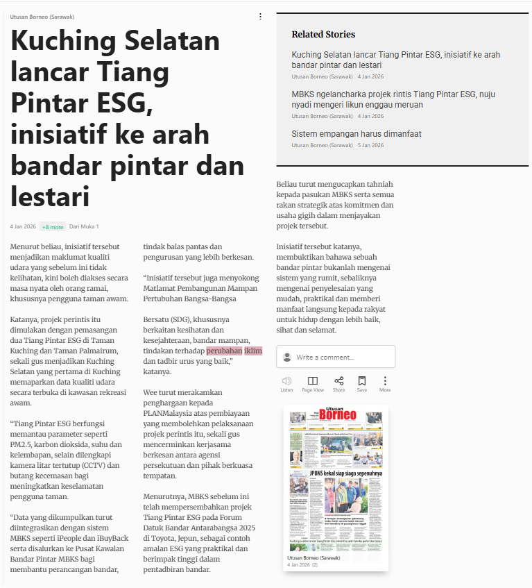 Bernama (2025) Kuching Selatan lancar Tiang Pintar ESG, inisiatif ke arah bandar pintar dan lestari. Utusan Borneo (Sarawak). |