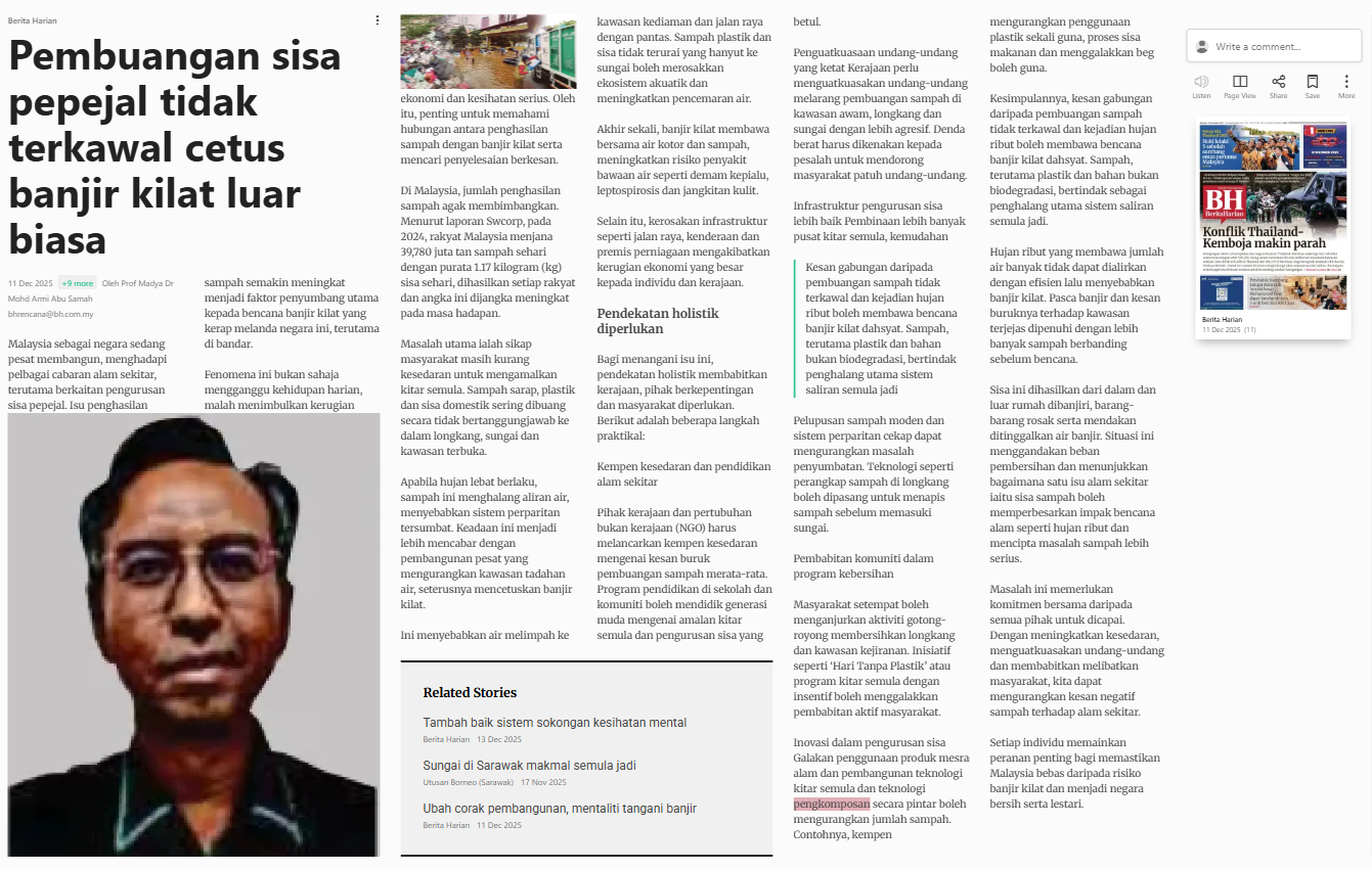 Prof Madya Dr Mohd Armi Abu Samah (2025) Pembuangan sisa pepejal tidak terkawal cetus banjir kilat luar biasa. Berita Harian. |