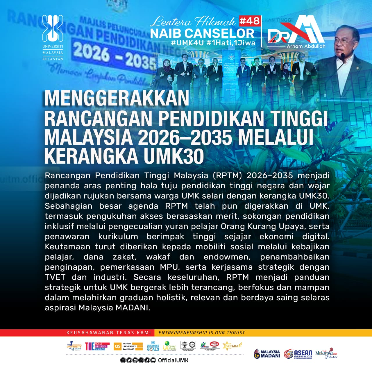 MENGGERAKKAN RANCANGAN PENDIDIKAN TINGGI MALAYSIA 2026–2035 MELALUI KERANGKA UMK30 Assalamualaikum Warahmatullahi Wabarakatuh, Warga UMK yang saya hormati, Rancangan Pendidikan Tinggi Malaysia (RPTM) 2026–2035 yang diumumkan baru-baru ini perlu difahami dan dihayati bersama oleh seluruh warga Universiti Malaysia Kelantan. Saya ingin agar warga UMK melihatnya sebagai penanda aras yang memperjelas hala tuju pendidikan tinggi negara serta peranan universiti awam dalam dekad akan datang. Justeru, RPTM ini dijadikan rujukan bersama dalam merancang, melaksana dan menilai setiap inisiatif di UMK, selari dengan kerangka strategik UMK30. Sebahagian besar hala tuju yang digariskan dalam RPTM sebenarnya telah pun mula dilaksanakan di UMK. Prinsip akses berasaskan merit diterjemahkan melalui pengukuhan program Asasi, Diploma dan laluan khas sebagai feeder ke peringkat ijazah, dengan penilaian yang mengambil kira kecemerlangan akademik serta potensi keusahawanan. Jaminan peluang kepada pelajar cemerlang yang memilih UMK sebagai pilihan utama akan terus dilaksanakan secara telus dan berdisiplin di semua peringkat pengurusan. Dalam masa yang sama, pengecualian yuran pengajian kepada pelajar Orang Kurang Upaya sebagai langkah memperkukuh akses pendidikan yang inklusif dan berkeadilan merupakan inisiatif nasional yang wajar disokong bersama. Sejajar dengan itu, UMK melaksanakan pengecualian yuran kepada pelajar Orang Kurang Upaya secara teratur dan berfokus. Ketika ini, UMK menyediakan pembiayaan yuran pengajian kepada 31 orang pelajar Orang Kurang Upaya dengan anggaran kos sekitar RM180,000, disokong penambahbaikan kemudahan serta pendekatan pengajaran yang lebih responsif, sebagai komitmen universiti untuk memastikan tiada pelajar yang tercicir daripada ekosistem pembelajaran. RPTM turut menekankan kepentingan kurikulum berimpak tinggi yang sejajar dengan ekonomi digital. Di UMK, saya optimis bahawa langkah ini boleh diperkukuh melalui penawaran dan penambahbaikan program strategik dalam bidang kecerdasan buatan, sains data dan komputeran, komunikasi dan media digital, ekonomi, perakaunan serta kewangan. Pendekatan pengajaran berasaskan experiential learning, industry-based projects dan Problem-Based Learning (PBL), bersama kerjasama industri, akan terus diperkasakan bagi memastikan graduan kekal relevan dan berdaya saing. Besar harapan saya agar warga UMK memberi keutamaan kepada aspek mobiliti sosial dengan menggerakkan bantuan kebajikan pelajar, dana zakat, wakaf dan endowmen secara strategik serta diperkukuh melalui pendekatan keusahawanan. Melalui usaha ini, UMK memainkan peranan sebagai pemutus rantaian kemiskinan dan membantu pelajar keluar daripada garisan kemiskinan. Penyelarasan Tingkatan 6 dan Matrikulasi di bawah Kementerian Pendidikan Tinggi pula dimanfaatkan melalui program pendedahan awal universiti dan pemetaan kurikulum bagi membina talent pipeline yang lebih tersusun. Kebajikan pelajar, termasuk aspek penginapan, perlu diberi perhatian berterusan sebagai sebahagian daripada pengalaman pembelajaran di kampus. Dengan hampir 14,800 pelajar dan kapasiti penginapan sekitar 42 peratus, saya melihat usaha menambah baik kemudahan serta meneroka kerjasama strategik, termasuk dengan syarikat berkaitan kerajaan, sebagai langkah penting untuk menyokong kesejahteraan dan pengalaman pelajar di UMK. Pemerkasaan Mata Pelajaran Umum (MPU) pula dilaksanakan melalui semakan semula kurikulum yang menekankan pembinaan jati diri, penghayatan sejarah, Perlembagaan dan nilai kenegaraan. Di UMK, pendekatan ini diperkukuh melalui integrasi elemen keusahawanan, kepimpinan dan pembangunan komuniti, serta pelaksanaan aktiviti berteraskan kenegaraan dan tanggungjawab sosial. Saya percaya usaha ini membantu membentuk graduan yang holistik, beretika dan memiliki identiti kebangsaan yang kukuh. Dalam landskap pendidikan tinggi yang semakin dinamik pula, Pendidikan dan Latihan Teknikal dan Vokasional (TVET) dilihat sebagai rakan strategik kepada universiti. Melalui kerjasama dengan politeknik dan kolej komuniti, laluan pendidikan dapat dibentuk dengan lebih fleksibel dan responsif kepada keperluan industri. Pendekatan ini menyokong pembangunan bakat yang merangkumi graduan profesional serta tenaga teknikal dan juruteknik berkemahiran tinggi dalam bidang teknologi baharu. Secara keseluruhannya, RPTM 2026–2035 menyediakan hala tuju yang jelas bagi transformasi pendidikan tinggi negara. Bagi UMK, dasar ini menjadi panduan untuk bergerak ke hadapan secara terancang dan berfokus. Saya mengharapkan warga UMK terus bersama-sama menjayakan agenda ini selari dengan aspirasi Malaysia MADANI dan kerangka strategik UMK30. Sekian, terima kasih. Ikhlas daripada, |