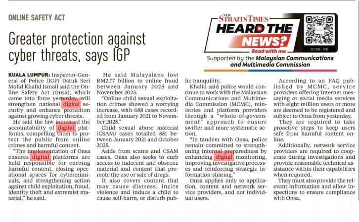 Bernama (2026) Greater protection against cyber threats, says IGP. New Straits Times. |