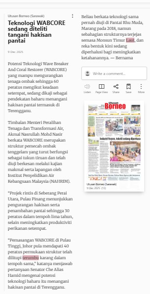 UNSPECIFIED Teknologi Wabcore Sedang Diteliti Tangani Hakisan Pantai. UNSPECIFIED. |