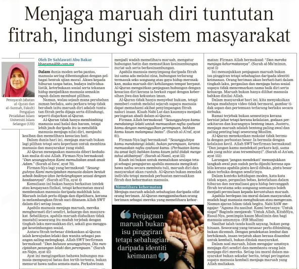 Dr. Sahlawati Abu Bakar (2025) Menjaga maruah diri tuntutan fitrah, lindungi sistem masyarakat. Berita Harian. |