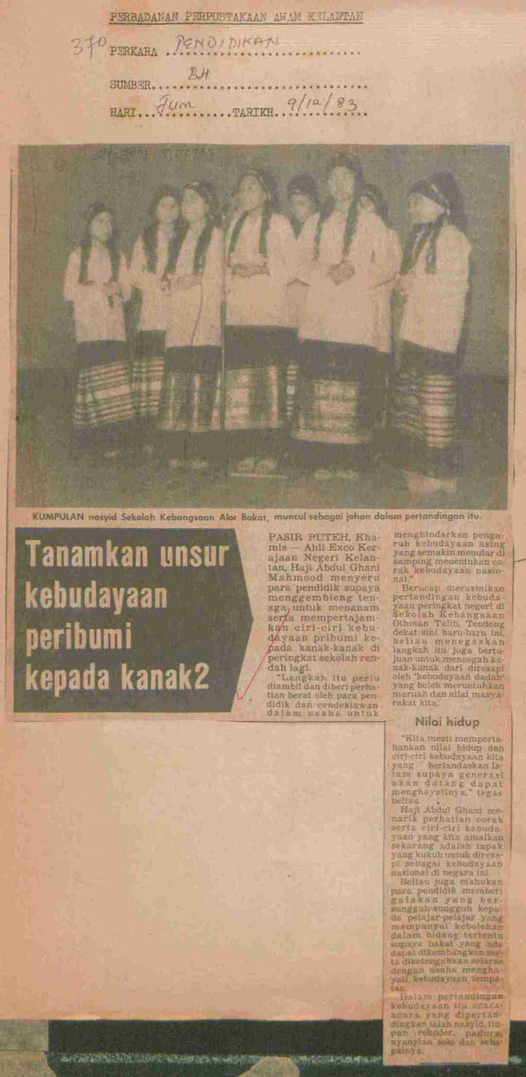 Berita Harian (1983) Tanamkan unsur kebudayaan peribumi kepada kanak2. Berita Harian. |