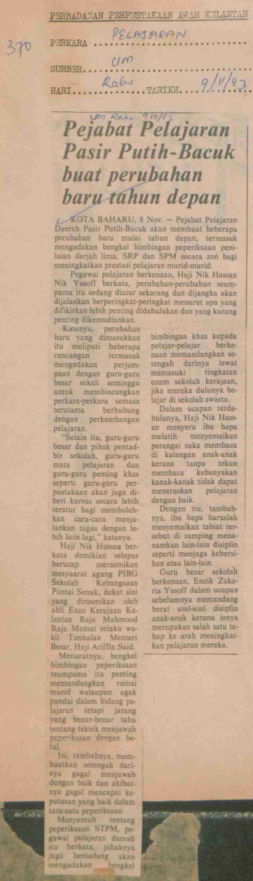 Utusan Malaysia (1983) Pejabat Pelajaran Pasir Putih-Bacuk buat perubahan baru tahun depan. Utusan Malaysia. |