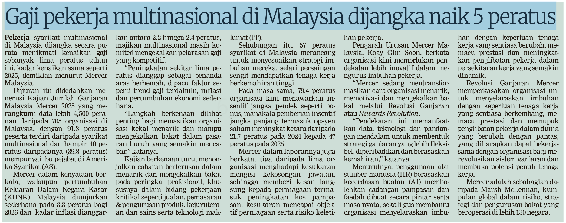 Rafhanah Hazirah Ramlin (2026) Gaji Pekerja Multinasional di Malaysia dijangka Naik 5%. Berita Harian. |
