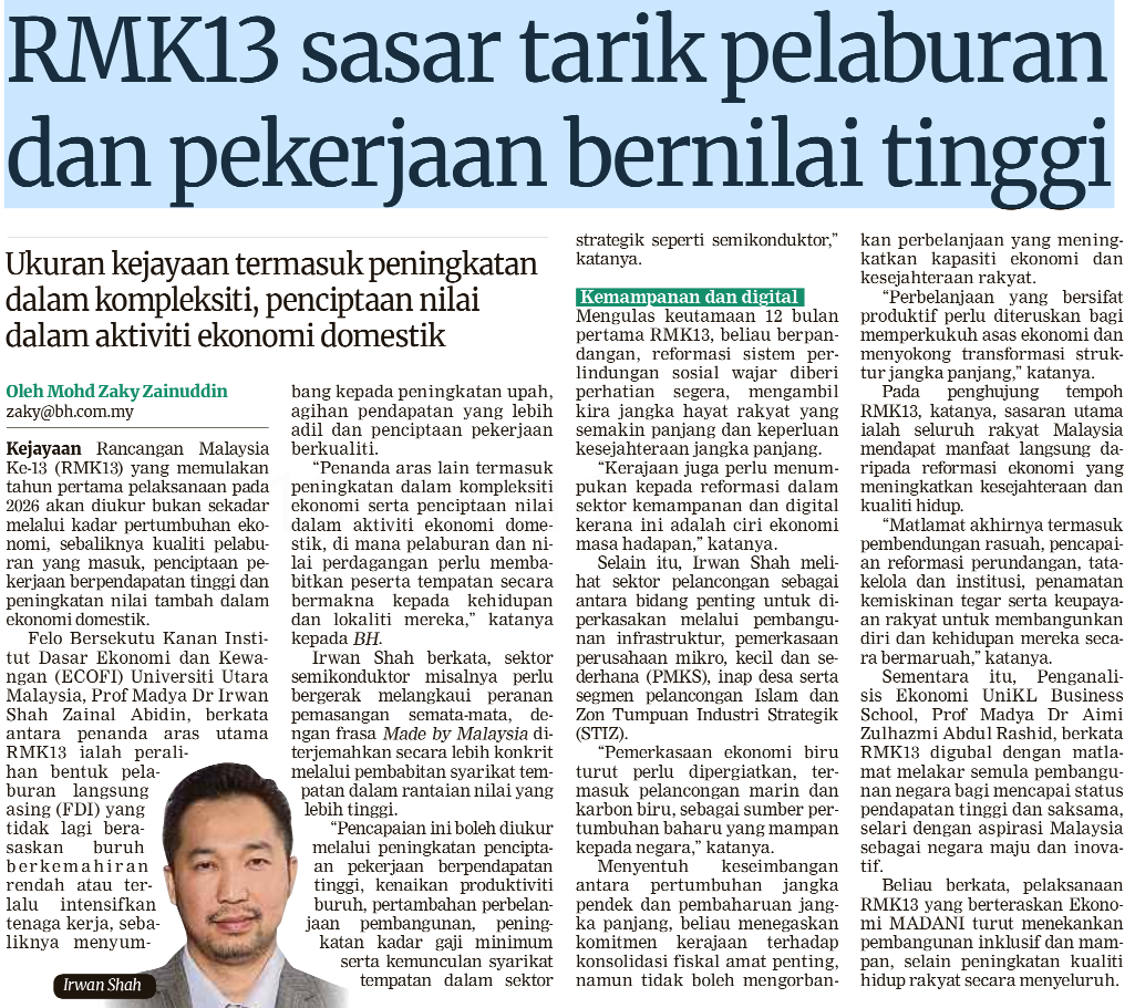Mohd Zaky Zainuddin (2026) RMK13 Sasar Tarik Pelaburan dan Pekerjaan Bernilai Tinggi. Berita Harian. |