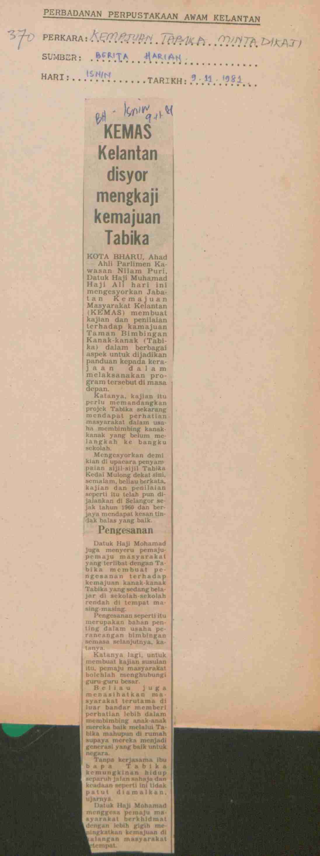 Berita Harian (1981) KEMAS Kelantan disyor mengkaji kemajuan Tabika. Berita Harian. |