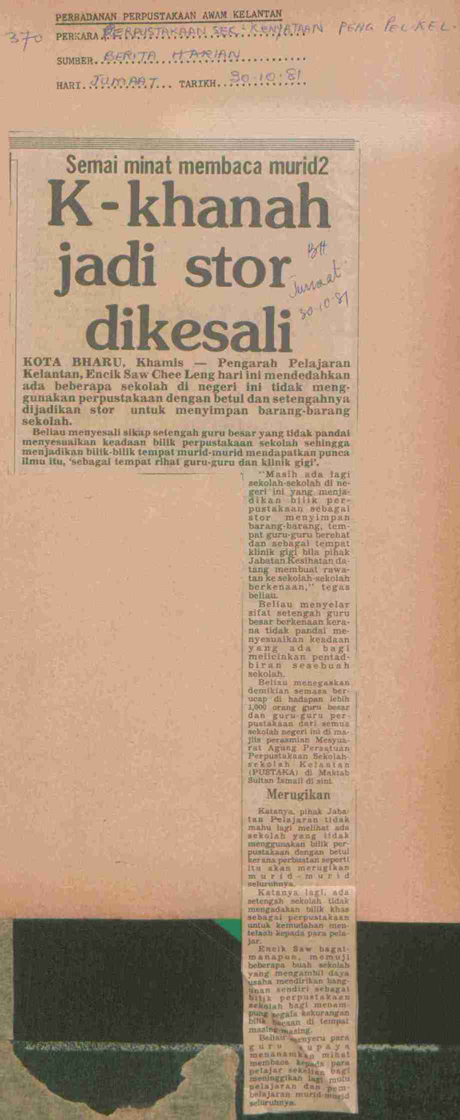Berita Harian (1981) K-khanah jadi stor dikesali. Berita Harian. |