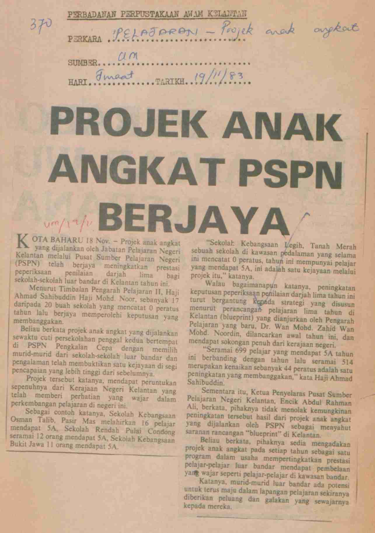 Utusan Malaysia (1983) PROJEK ANAK ANGKAT PSPN BERJAYA. Utusan Malaysia. |
