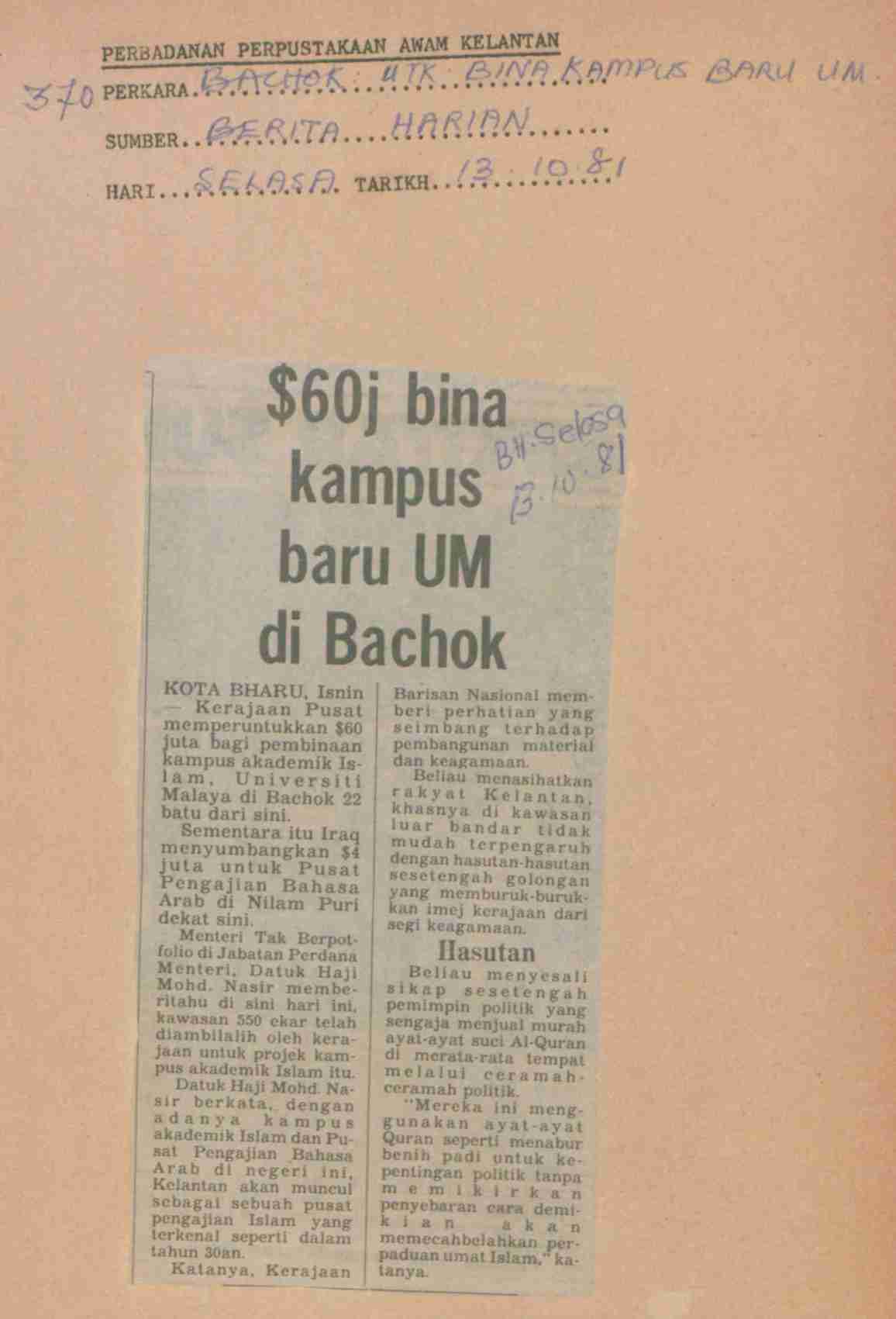 Berita Harian (1981) $60j bina kampus baru UM di Bachok. Berita Harian. |