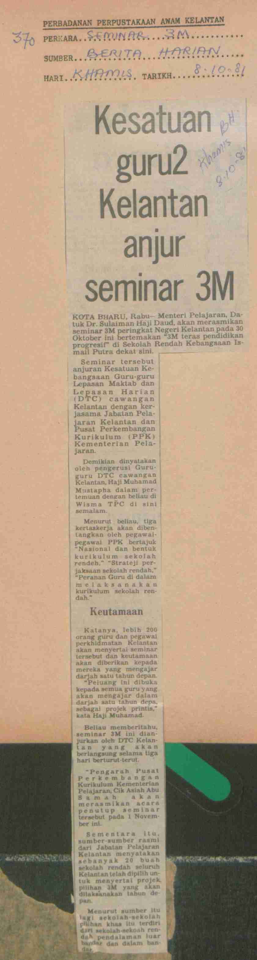 Berita Harian (1981) Kesatuan guru2 Kelantan anjur seminar 3M. Berita Harian. |