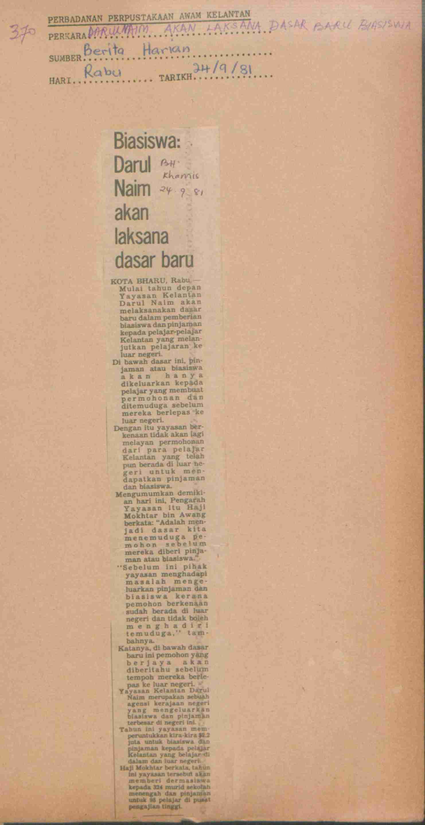 Berita Harian (1981) Biasiswa Darul Naim akan laksana dasar baru. Berita Harian. |