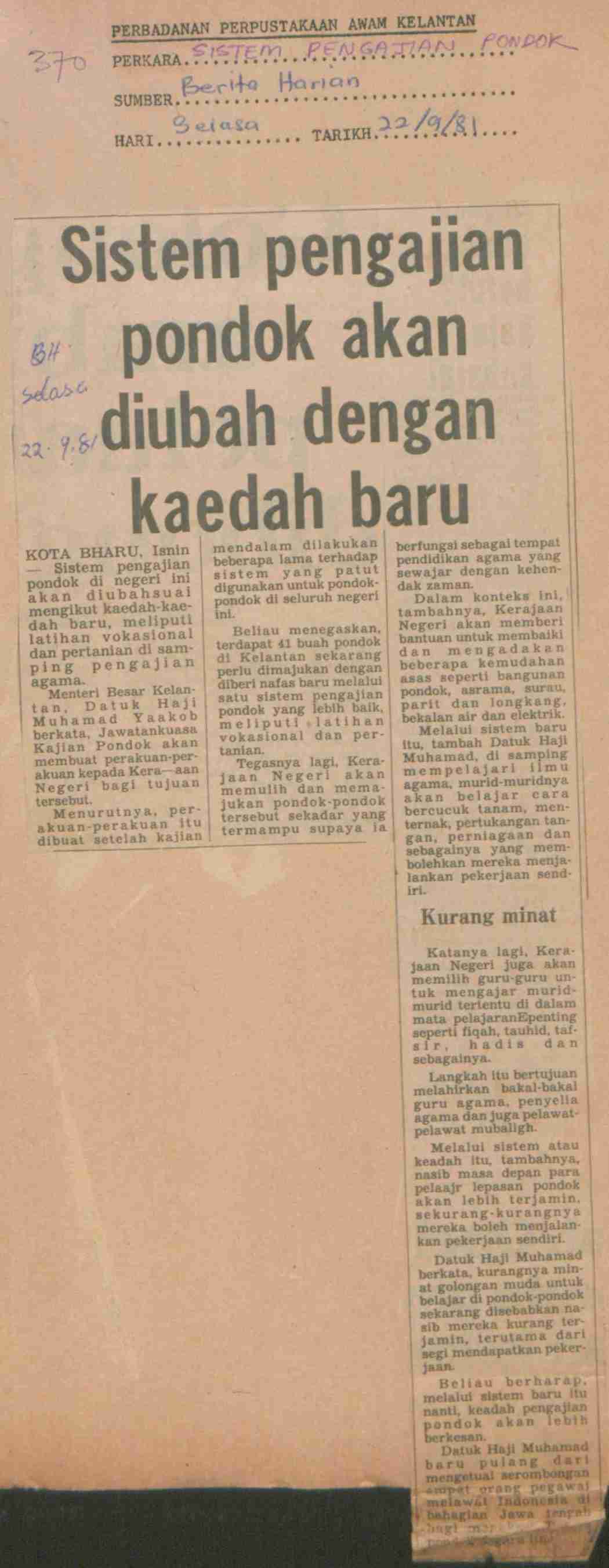 Berita Harian (1981) Sistem pengajian pondok akan diubah kaedah baru. Berita Harian. |