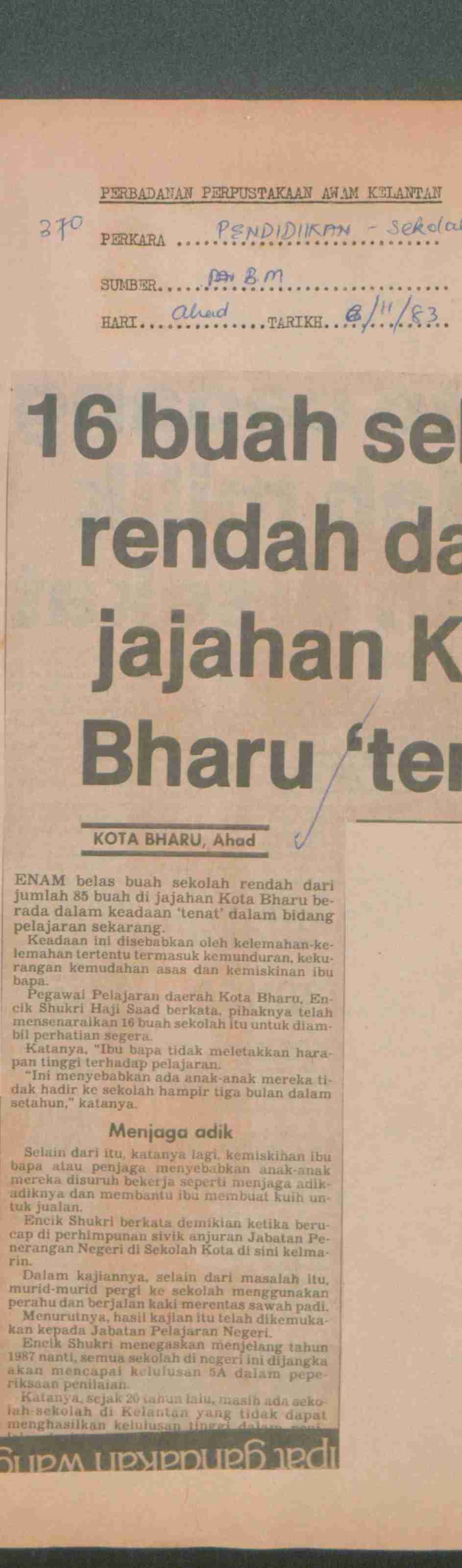 Berita Harian (1983) 16 buah sekolah rendah dari jajahan Kota Bharu "tenat". Berita Harian. |