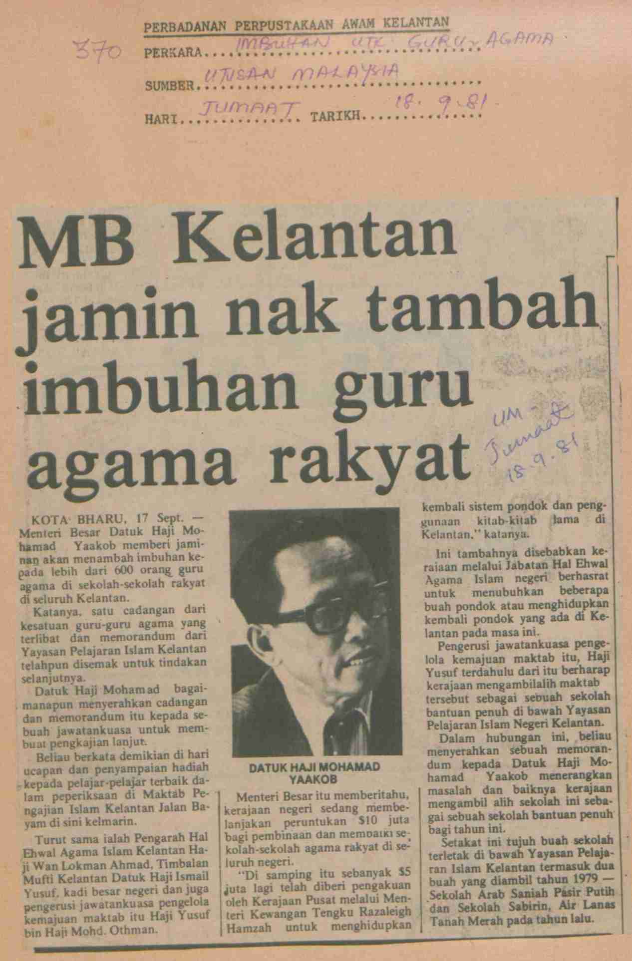 Utusan Malaysia (1981) MB Kelantan jamin nak tambah imbuhan guru agama rakyat. Utusan Malaysia. |