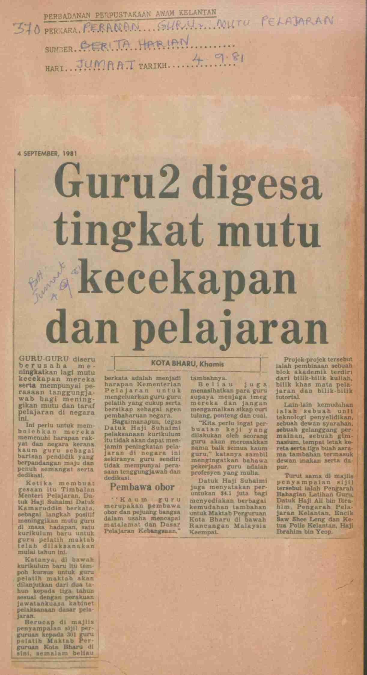 Berita Harian (1981) Guru2 digesa tingkat mutu kecekapan dan pelajaran. Berita Harian. |
