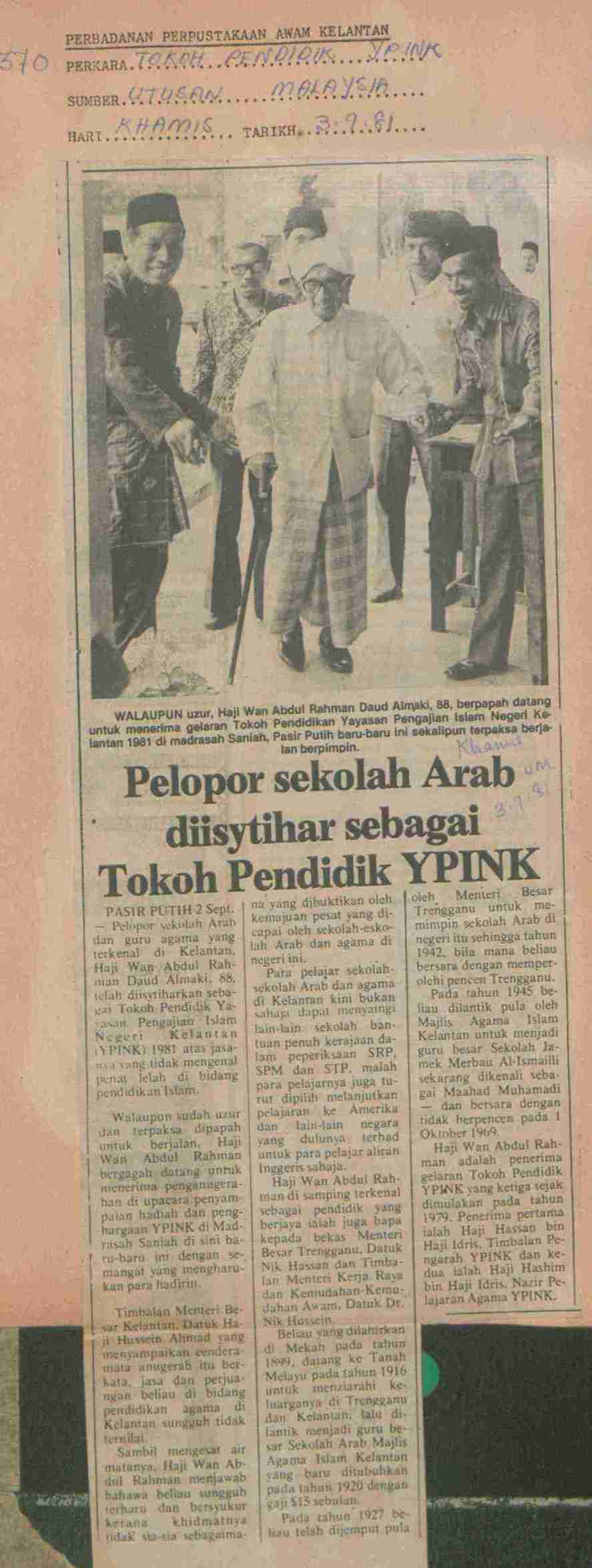 Utusan Malaysia (1981) Pelopor sekolah Arab diisytihar sebagai Tokoh pendidik YPINK. Utusan Malaysia. |