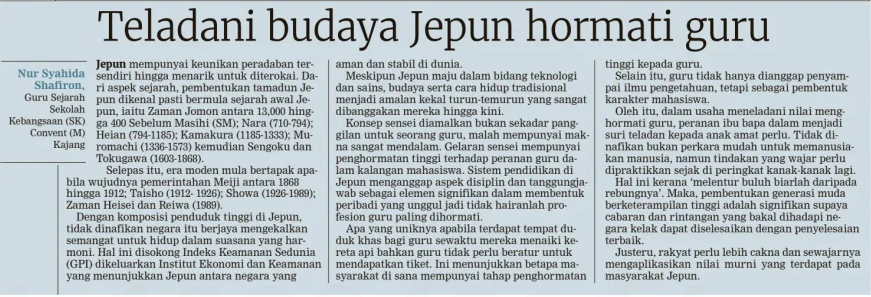 Nur Syahida Shafiron (2025) Teladani budaya Jepun hormati guru. Berita Harian. |