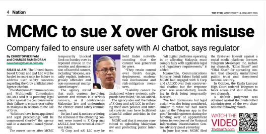 Fam, Christopher and Ramendran, Charles (2026) MCMC to sue X over Grok misuse. The Star. |