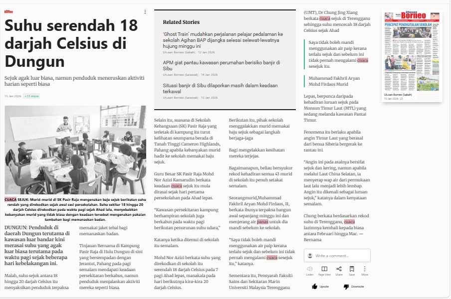 Bernama (2026) Suhu Serendah 18 Darjah Celsius Di Dungun. Utusan Borneo (Sabah). |