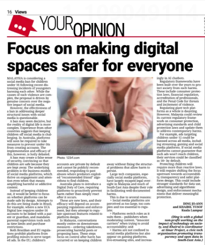 Ann, Ding Jo and Khairil Yusof (2025) Focus on making digital spaces safer for everyone. The Star. |
