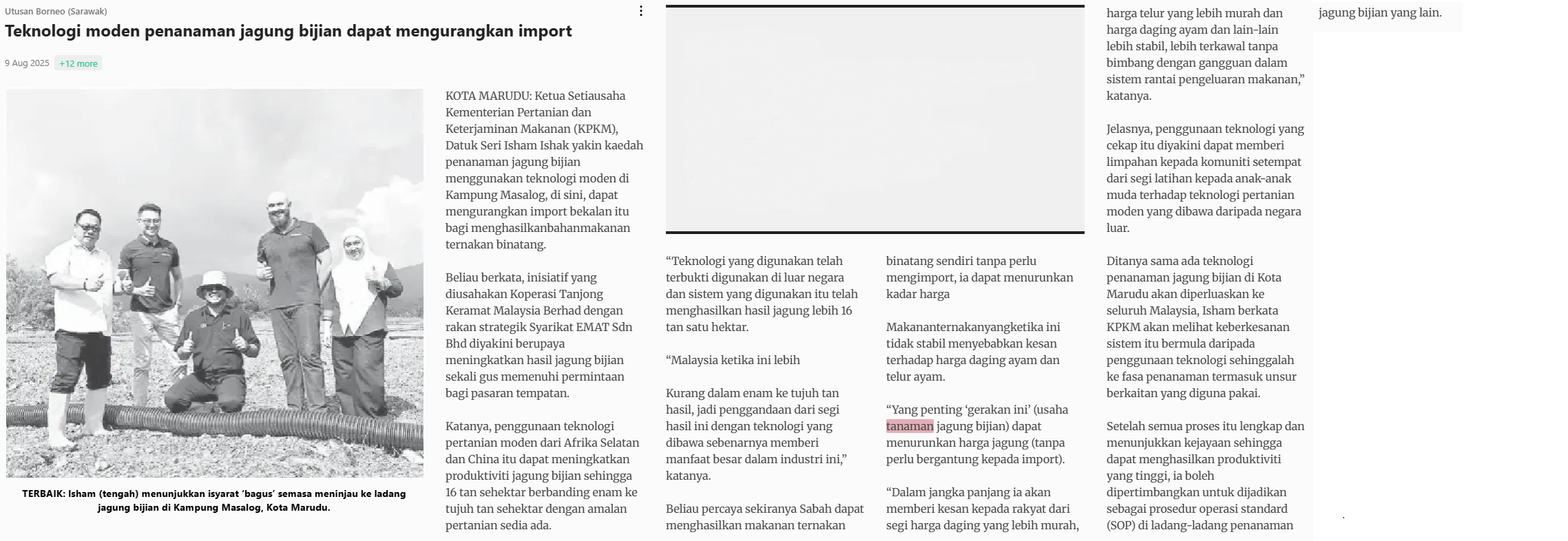 Utusan Borneo (Sarawak) (2025) Teknologi moden penanaman jagung bijian dapat mengurangkan import. Utusan Borneo (Sarawak). |