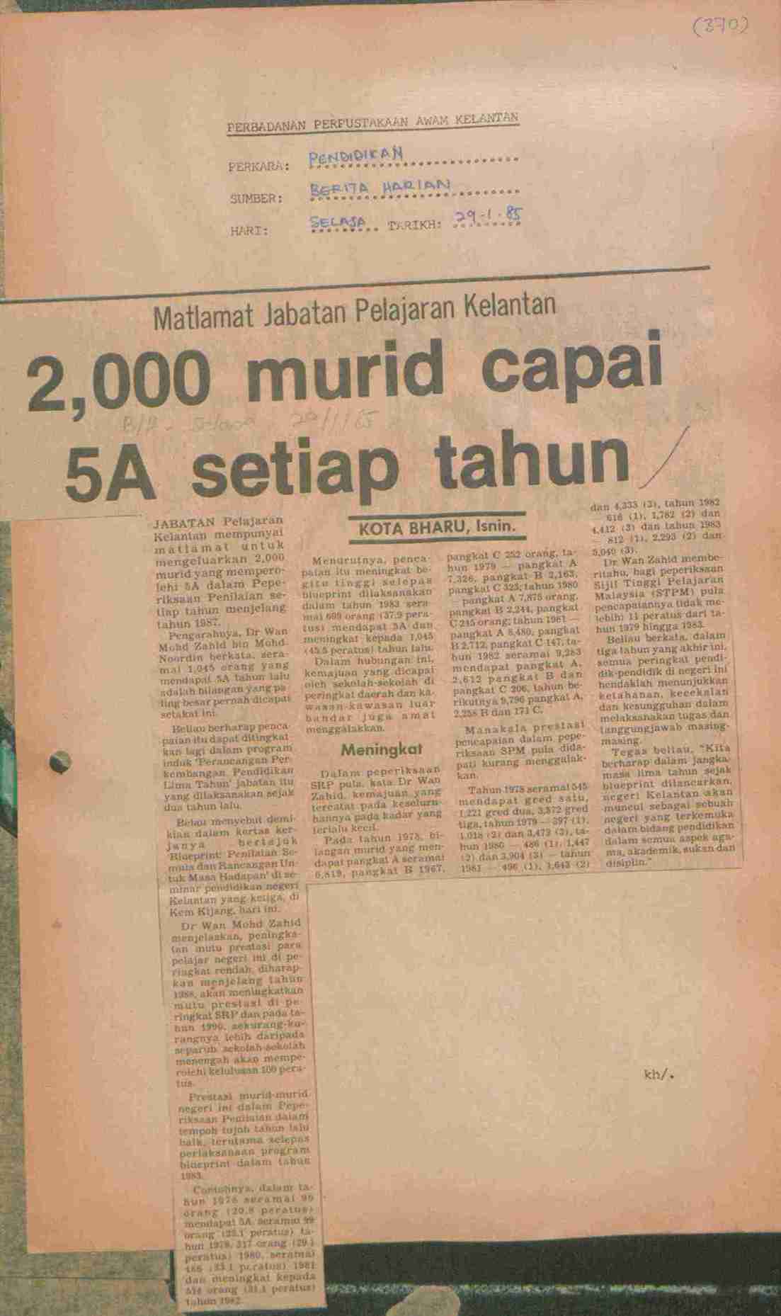 Berita Harian (1985) 2,000 murid capai 5A setiap tahun. Berita Harian. |