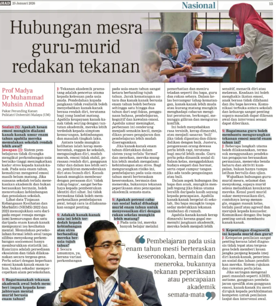 Prof. Madya Dr. Muhammad Muhsin Ahmad (2026) Hubungan mesra guru-murid redakan tekanan. Berita Harian. |