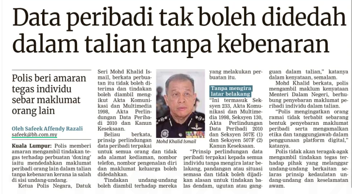 Safeek Affendy Razali (2026) Data peribadi tak boleh didedah dalam talian tanpa kebenaran. Berita Harian. |