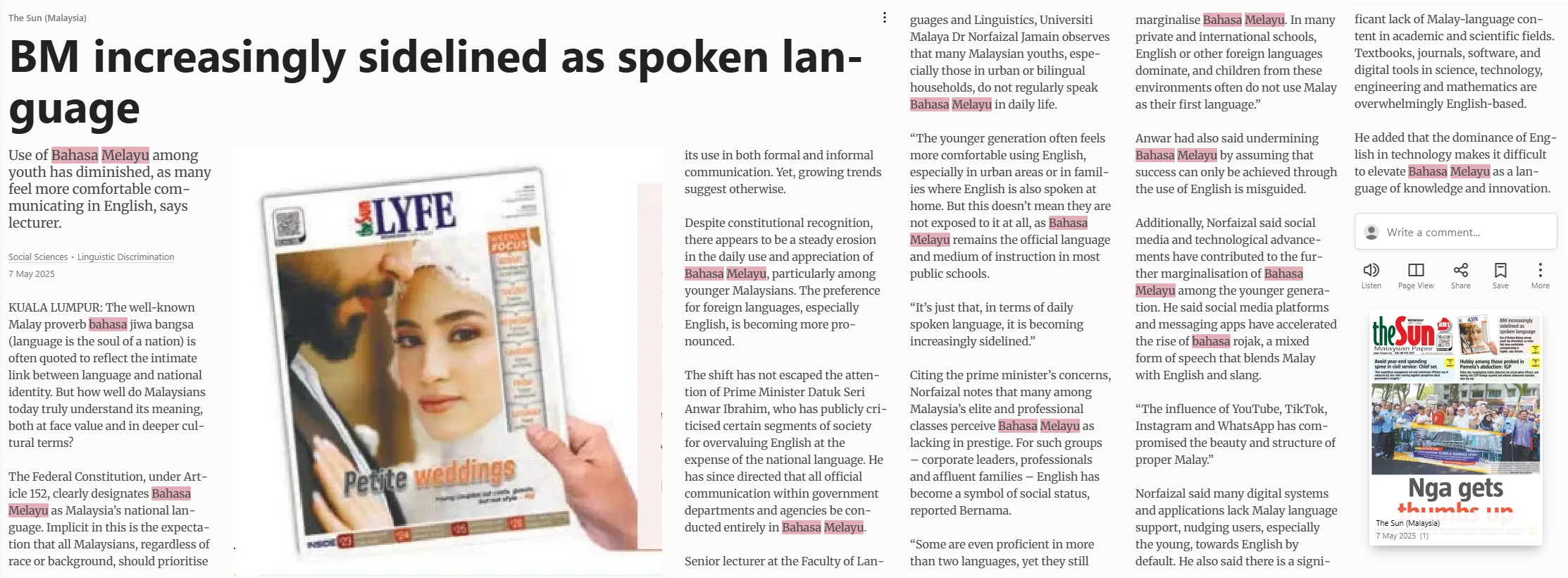Bernama (2025) BM increasingly sidelined as spoken language. The Sun (Malaysia). |