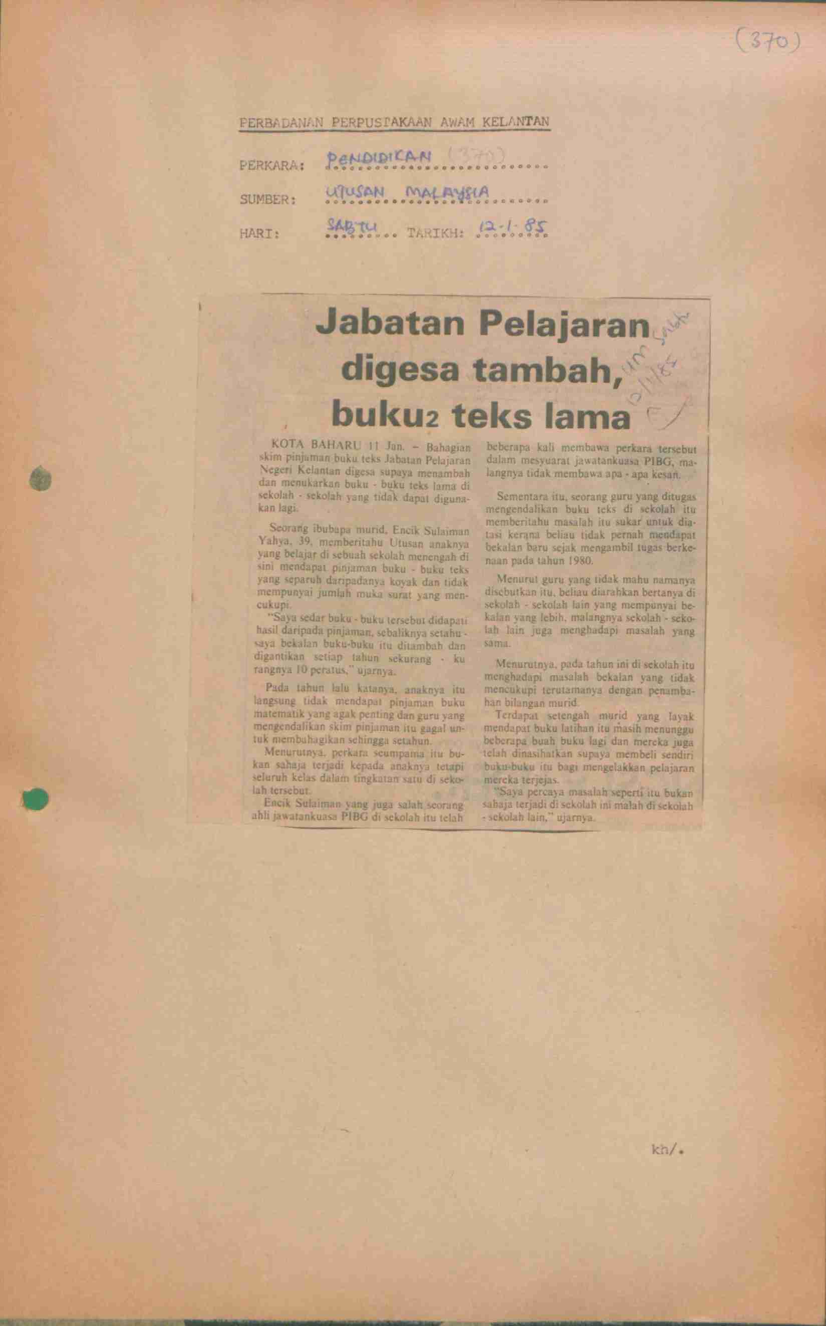 Utusan Malaysia (1985) Jabatan Pelajaran digesa tambah, buku2 teks lama. Utusan Malaysia. |