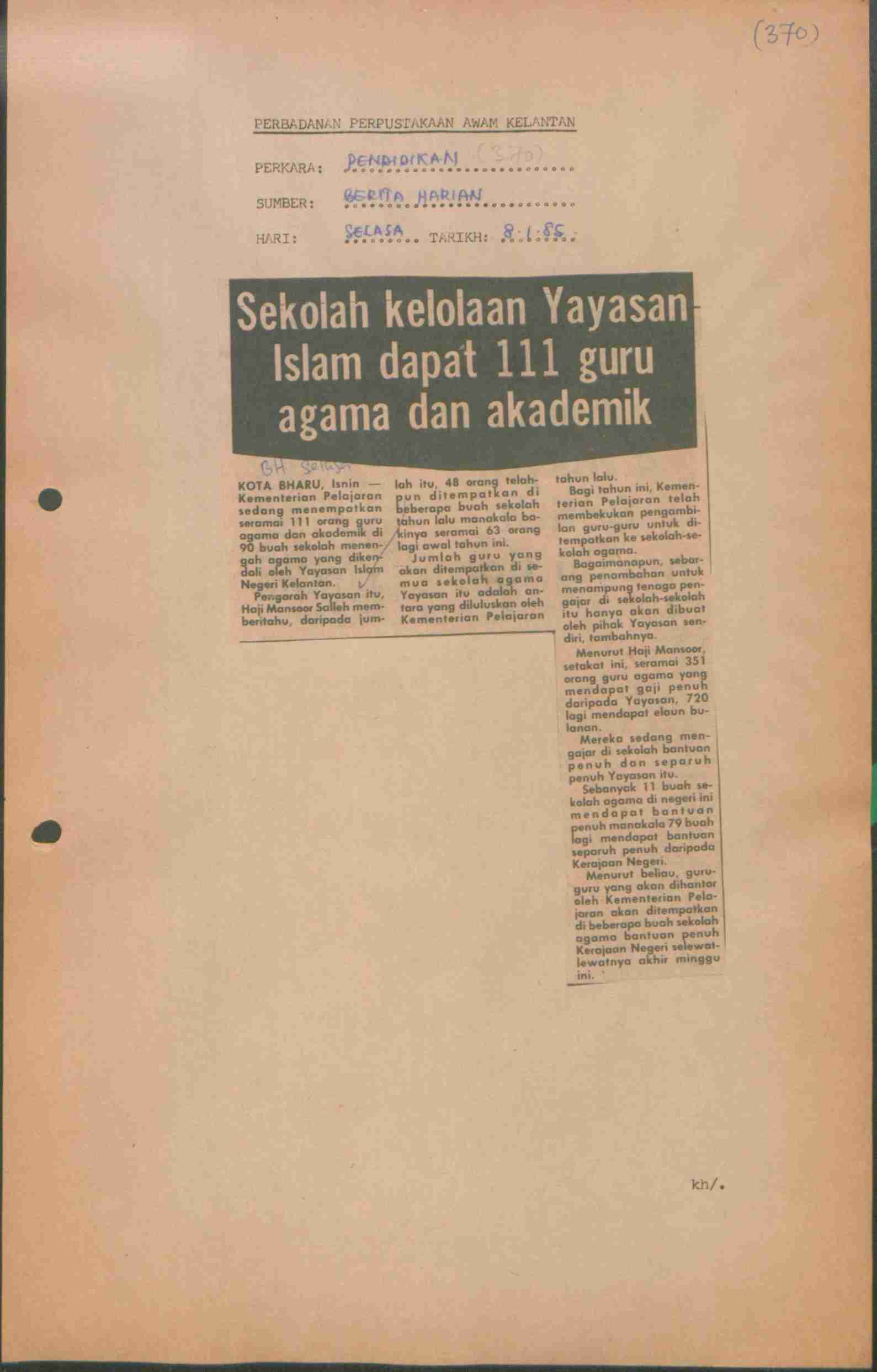 Berita Harian (1985) Sekolah kelolaan Yayasan Islam dapat 111 guru agama dan akademik. Berita Harian. |