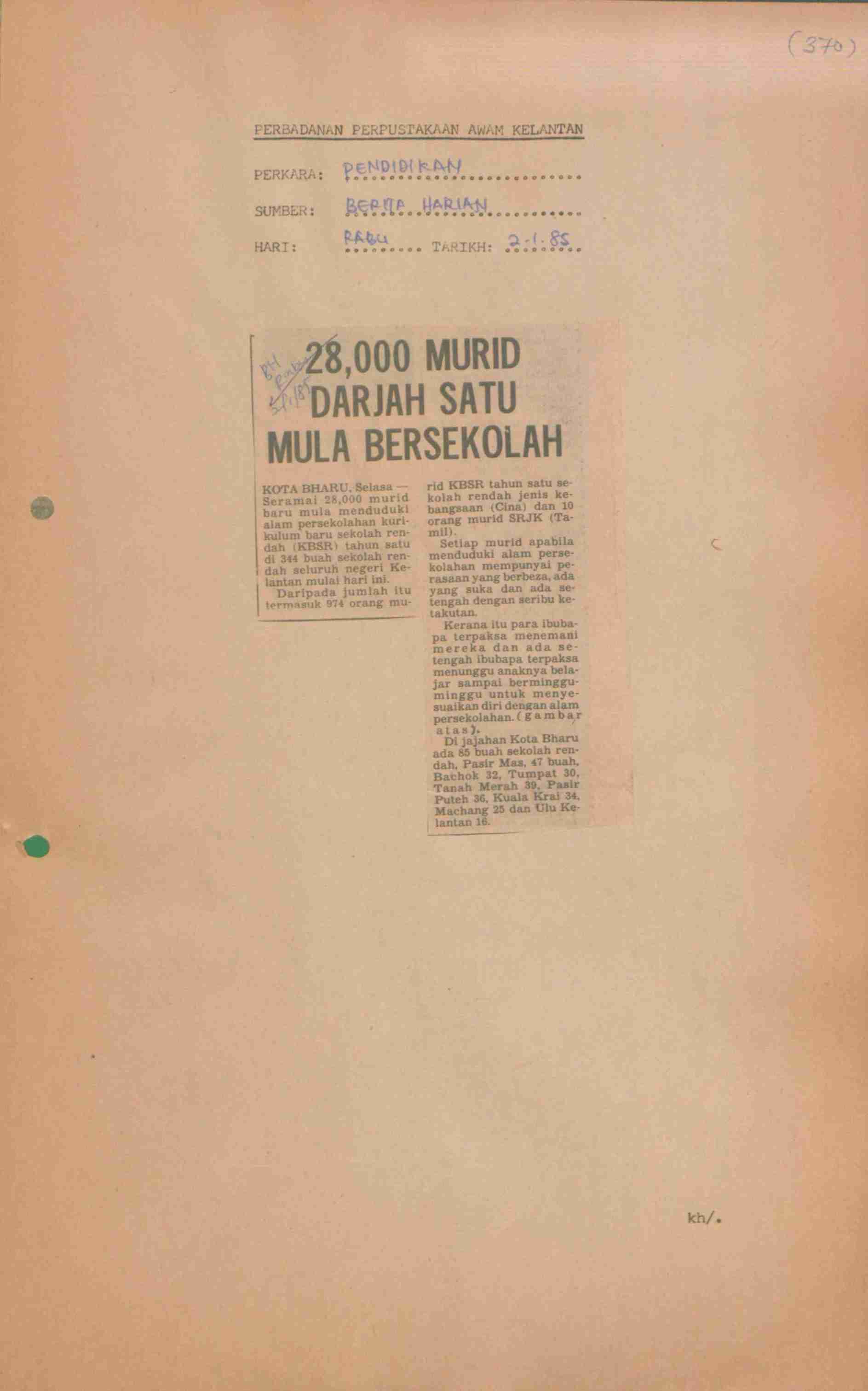 Berita Harian (1985) 28,000 murid darjah satu mula bersekolah. Berita Harian. |
