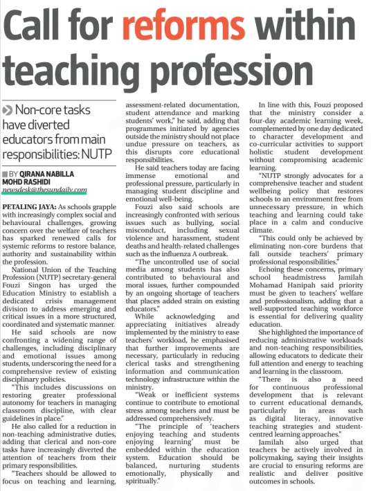 Qirana Nabilla Mohd Rashidi (2026) Call for reforms within teaching profession. The Sun (Malaysia). |